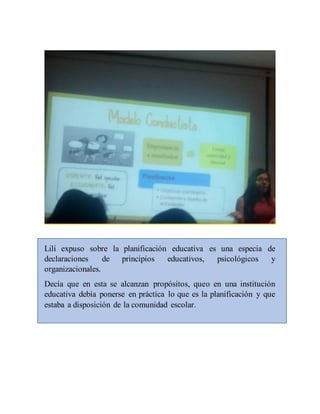 El documento discute varios aspectos de la planificación educativa, incluyendo atender las necesidades de los estudiantes, un sistema abierto de interacción entre la sociedad y la escuela, y establecer declaraciones de principios educativos. También señala que la planificación debe enfocarse en lograr resultados como el desempeño, la eficacia y la calidad educativa, además de contar con información completa sobre la infraestructura de la institución educativa e integrar a docentes, directivos, estudiantes y financiamiento.