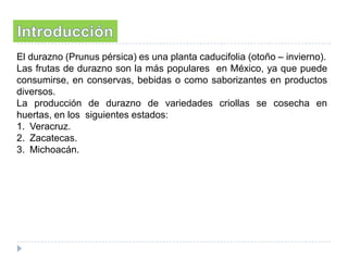 Este documento presenta un resumen sobre la propagación de plantas de durazno. Explica que el durazno es una planta caducifolia popular en México que se cosecha principalmente en Veracruz, Zacatecas y Michoacán. Describe los métodos de propagación sexual como la escarificación y estratificación de semillas, así como la propagación asexual a través de injertos, acodos y estacas. Finalmente, proporciona detalles sobre la preparación de sustratos, desinfección, épocas de injertación y almac
