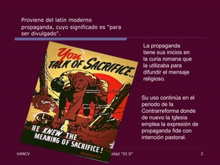 La propaganda tiene sus orígenes en la Iglesia católica para difundir el mensaje religioso. Consiste en utilizar información presentada masivamente con la intención de apoyar una determinada opinión política o ideológica, aunque la información pueda ser incompleta o parcial. Joseph Goebbels, ministro de propaganda nazi, usó 11 principios como simplificar el mensaje y presentar al enemigo de forma exagerada para influir en las masas.