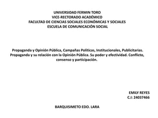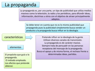 Este documento describe la propaganda, su relación con la opinión pública y su efectividad. Explica que la propaganda busca influir en la ideología de las personas utilizando medios masivos para difundir ideas. También analiza las campañas políticas, institucionales y publicitarias, señalando sus objetivos, características y tipos. Finalmente, resalta que la propaganda puede llegar a cambiar las decisiones e ideologías de las personas.