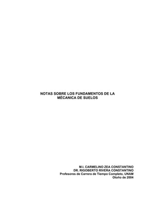 Este documento presenta una introducción a los fundamentos de la mecánica de suelos. Explica que los suelos pueden ser residuales o transportados y describe los diferentes tipos de suelos transportados como eólicos, aluviales, lacustres, de piemonte y volcánicos. También introduce conceptos clave como peso específico, contenido de agua, relación de vacíos y porosidad que ayudan a caracterizar las propiedades de los suelos. Finalmente, discute propiedades de los granos como forma, mineralogía y gran