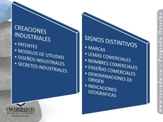El documento proporciona una introducción a la propiedad industrial, la cual incluye creaciones industriales como patentes, diseños industriales y secretos industriales, así como signos distintivos como marcas, lemas comerciales y denominaciones de origen. Explica los tipos de patentes, requisitos, titulares y derechos conferidos. También cubre diseños industriales, secretos industriales y los diferentes tipos y funciones de las marcas comerciales.