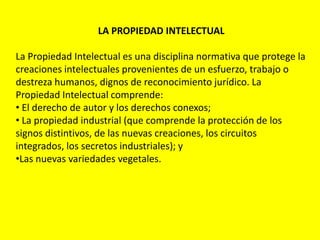 El documento trata sobre la propiedad intelectual. Explica que la propiedad intelectual protege las creaciones intelectuales humanas y comprende el derecho de autor, los derechos conexos y la propiedad industrial. Define el derecho de autor como la protección que otorga el Estado al creador de obras literarias o artísticas. También habla sobre los derechos morales y patrimoniales que reconoce la ley al autor como titular original de sus obras. Por último, explica brevemente el concepto de copyleft como alternativa al copyright tradic