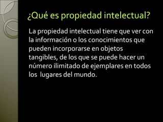 La propiedad intelectual incluye información y conocimientos que pueden incorporarse en objetos. Se divide en propiedad industrial y derechos de autor. Los derechos de autor incluyen derechos morales como la paternidad y derechos patrimoniales como la reproducción. La propiedad industrial comprende signos distintivos como marcas que identifican productos y modelos de utilidad que modifican objetos existentes.