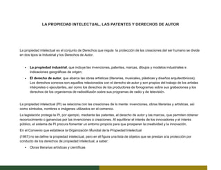 Este documento describe los diferentes tipos de propiedad intelectual, incluyendo derechos de autor, patentes, marcas, diseños industriales e indicaciones geográficas. Explica que la propiedad intelectual protege las creaciones del ser humano como obras literarias, invenciones y símbolos utilizados en el comercio. También define los conceptos de propiedad industrial y derechos de autor.