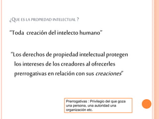 El documento describe los conceptos de propiedad intelectual e industrial, incluyendo derechos de autor y patentes. Explica que la propiedad intelectual protege las creaciones de la mente como obras literarias, artísticas, invenciones y símbolos. También cubre las leyes y organismos que regulan y protegen estos derechos en Chile, así como las excepciones permitidas para el uso de obras protegidas.