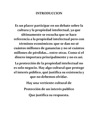 El documento resume la historia y la importancia de la propiedad intelectual. Explica que la protección de la propiedad intelectual tiene una vertiente cultural que protege el interés público. También discute los desafíos planteados por la tecnología digital y cómo las definiciones tradicionales de reproducción, distribución y comunicación fueron hechas para el mundo analógico y no se adaptan completamente al mundo digital.