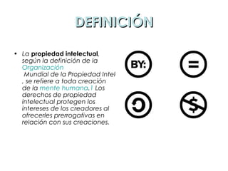 El documento define la propiedad intelectual como creaciones de la mente humana protegidas por derechos. Describe dos categorías principales: la propiedad industrial (patentes, marcas) y el derecho de autor (obras literarias y artísticas). Explica que Creative Commons ofrece licencias que permiten a los autores compartir sus obras mientras mantienen algunos derechos, a diferencia del copyright tradicional.
