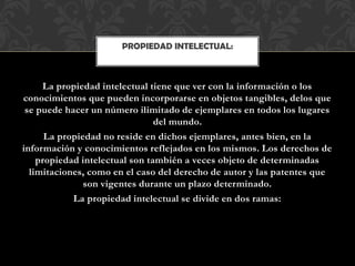 La propiedad intelectual se refiere a los derechos sobre conocimientos e información que pueden ser expresados en objetos tangibles, abarcando tanto la propiedad industrial como los derechos de autor. La propiedad industrial protege invenciones y marcas, mientras que los derechos de autor otorgan al creador el control sobre su obra y su reconocimiento. Existen derechos morales y patrimoniales que permiten al autor decidir sobre la divulgación y obtener beneficios económicos por su trabajo.