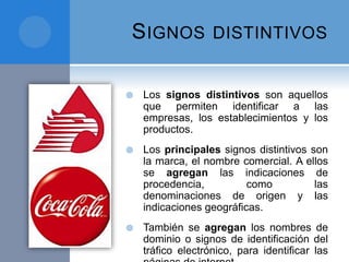 Este documento habla sobre los signos distintivos de la propiedad intelectual, incluyendo las marcas, nombres comerciales y otros. Define los tipos de marcas como nominativas, innominadas, mixtas y tridimensionales. También cubre conceptos como el nombre comercial, marca colectiva, proceso de registro de marcas y protección legal internacional a través de organizaciones como la OMPI.
