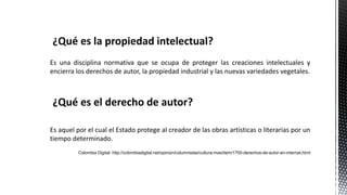 La propiedad intelectual protege las creaciones de la mente como obras literarias, artísticas, invenciones y símbolos. En Colombia, la ley protege los derechos de autor por un tiempo determinado. Creative Commons ofrece licencias flexibles para permitir el uso y distribución de contenido con ciertas condiciones como reconocer la autoría.