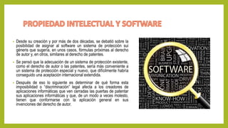 El documento discute los diferentes enfoques para proteger la propiedad intelectual de software, incluyendo el derecho de autor y las patentes. Explica que inicialmente se debatió si el software debería tener un sistema de protección único, pero que finalmente se determinó que adaptar sistemas existentes como el derecho de autor sería más conveniente. También describe cómo diferentes países como Argentina y Perú protegen legalmente el software bajo el derecho de autor.
