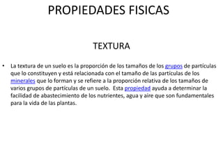 Este documento describe las propiedades físicas, químicas y coloidales del suelo. Detalla la textura, estructura, porosidad, temperatura y capacidad de intercambio iónico del suelo, así como los procesos ácido-base, redox y las propiedades coloidales. Finalmente, clasifica los tipos de suelo según sus características físicas, incluyendo litosoles, cambisoles, luvisoles y otros.