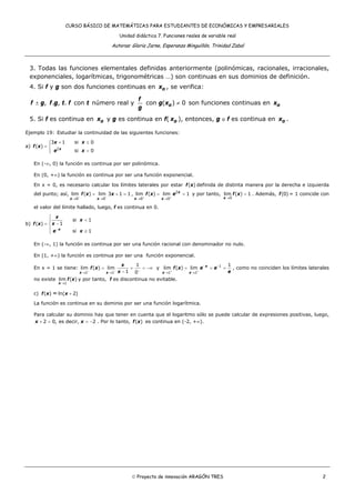 Este documento presenta el concepto de continuidad de funciones reales de variable real. Explica que una función es continua en un punto si su gráfica se puede dibujar sin levantar el lápiz y si pequeñas variaciones en la variable x producen pequeñas variaciones en f(x). Además, formaliza la definición de continuidad mediante límites y analiza ejemplos de funciones continuas e discontinuas en diferentes puntos. Por último, enumera propiedades de las funciones continuas.