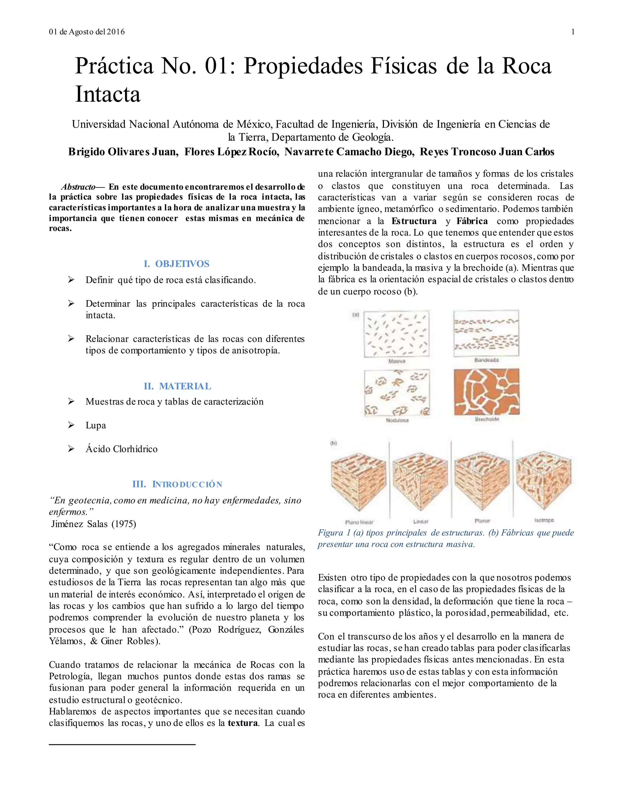 El documento detalla un estudio sobre las propiedades físicas de rocas intactas, enfocándose en su clasificación y comportamiento mecánico para aplicaciones geotécnicas. Se analizan diferentes muestras de rocas, como granito y caliza, evaluando su textura, densidad, porosidad y resistencia a compresión. Se concluye que las características de las rocas influyen significativamente en su idoneidad para construcciones como túneles, presas y minas.
