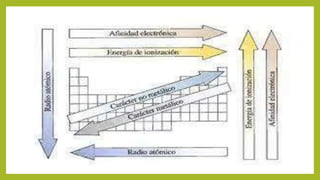El documento describe las propiedades periódicas de los elementos químicos. Explica que los elementos electropositivos tienden a perder electrones para formar cationes mientras que los electronegativos tienden a ganar electrones para formar aniones. También establece las valencias más comunes de los elementos en los diferentes grupos, siendo igual al número de grupo para los de I a IV y 8 menos el número de grupo o igual al número de grupo para los de V a VII.