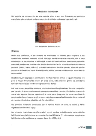 Este documento trata sobre los materiales de construcción. Explica que los primeros materiales utilizados por el hombre fueron el barro, la piedra y las fibras vegetales. Luego, con el desarrollo de la tecnología, se empezaron a elaborar materiales como el ladrillo de barro y el ladrillo de arcilla cocida. También describe las características principales que deben cumplir los materiales de construcción, como ser duraderos, provenir de materias primas abundantes y tener procesos de manufactura sencillos. Finalmente, det