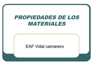 Este documento describe las principales propiedades de los materiales divididas en cuatro categorías: propiedades físicas y químicas, propiedades mecánicas, ensayos y propiedades tecnológicas. Resume las propiedades más importantes de cada categoría, incluyendo la conductividad, magnetismo, corrosión, oxidación, dureza, elasticidad, resistencia y fragilidad. También cubre propiedades como maleabilidad, ductilidad, soldabilidad, templabilidad y maquinabilidad.