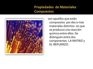Este documento trata sobre los materiales compuestos. Explica que son materiales formados por dos o más materiales que no reaccionan químicamente entre sí, y están compuestos de una matriz y un refuerzo. También describe varios tipos de materiales compuestos como los reforzados con partículas o fibras, y los materiales compuestos estructurales.