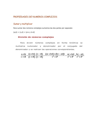 Para sumar números complejos se suman las partes reales y las partes imaginarias por separado. Para dividir números complejos, se multiplica el numerador y el denominador por el conjugado del denominador y luego se realizan las operaciones.