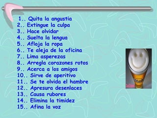 Este documento promueve los supuestos beneficios del alcohol y ofrece consejos sobre cómo lidiar con sus efectos negativos. Lista 31 formas en que el alcohol puede mejorar la vida social o emocional de una persona y luego describe 11 síntomas de la intoxicicación con sus posibles causas y soluciones. Finalmente, anima a compartir la información con otros para que también puedan disfrutar de los beneficios del alcohol.