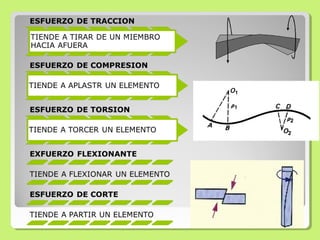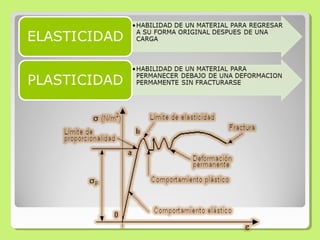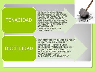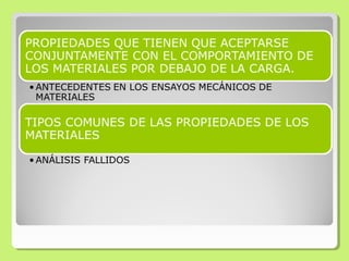Este documento describe varias propiedades mecánicas importantes de los materiales y los ensayos asociados. Las propiedades incluyen resistencia a la rotura, rigidez, ductilidad, módulo de resilencia, módulo de tenacidad, dureza, resistencia a la fatiga, fluencia y ruptura. Los ensayos comunes incluyen ensayos de tracción universal, impacto, fluencia y rotura. El documento también cubre conceptos como concentración de esfuerzos y análisis de fallas.