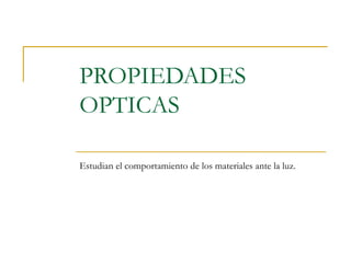 Este documento describe las propiedades ópticas de los materiales y cómo afectan la transmisión y reflexión de la luz. Explica que los materiales pueden ser transparentes, translúcidos u opacos dependiendo de si permiten o no el paso de la luz y la visión. También describe cómo la reflexión de la luz depende de la lisura y color de la superficie de un material, y cómo algunos materiales reflejantes se usan en arquitectura.
