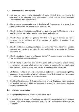 El documento explica los requisitos para que un conjunto de enunciados se considere un texto. Para ser un texto, debe cumplir tres condiciones: ser adecuado a la situación comunicativa y al propósito del emisor, ser coherente en su mensaje, y estar cohesionado mediante conexiones entre sus partes. Asimismo, analiza los aspectos que deben considerarse para que un texto sea adecuado, como la localización, los elementos de la comunicación (emisor, receptor, tema, canal, código), y la intención comunicativa del autor.