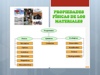 Este documento describe las principales propiedades mecánicas, físicas, eléctricas, magnéticas, químicas y ecológicas de los materiales. Explica propiedades como la dureza, tenacidad, elasticidad, conductividad, magnetismo, oxidación, reciclabilidad y toxicidad, y cómo estas propiedades determinan la respuesta de los materiales a estímulos externos como fuerzas, luz, sonido, corrientes eléctricas y reacciones químicas.