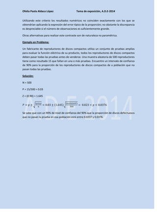 Este documento describe cómo calcular un intervalo de confianza para una proporción poblacional π a partir de una muestra. Explica que el estimador puntual de π es la proporción muestral p, y que para un tamaño muestral moderadamente grande, p sigue una distribución normal. El intervalo de confianza para π se centra en p, con límites de p ± z/2*error típico de p, donde z/2 es el valor crítico de la distribución normal. También menciona alternativas como tratar a