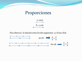 Este documento explica las proporciones y cómo usarlas para encontrar términos desconocidos. Define una proporción como una igualdad entre dos fracciones equivalentes. Proporciona ejemplos de usar proporciones para relacionar el consumo de kilowatts-hora con el costo, y para resolver otros problemas matemáticos. Finalmente, incluye enlaces a recursos adicionales sobre proporciones.