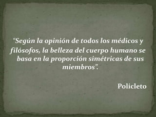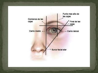 El documento describe los principios de las proporciones áureas y su aplicación al análisis facial. Explica que la belleza del rostro humano se basa en proporciones simétricas y que conceptos matemáticos como las proporciones de Fibonacci se usan para lograr armonía facial. También detalla puntos y líneas de referencia importantes para el análisis facial y las proporciones ideales de acuerdo a factores como edad, raza y sexo.