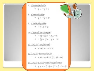 Este documento presenta conceptos básicos de lógica proposicional como proposiciones, valores lógicos de proposiciones, conectivos lógicos, proposiciones simples y compuestas. Define una proposición como un juicio declarativo que puede ser verdadero o falso pero no ambos. Explica que las proposiciones se representan con letras minúsculas y su valor lógico es 1 si es verdadera y 0 si es falsa. Además, introduce los conectivos lógicos básicos como "no", "y