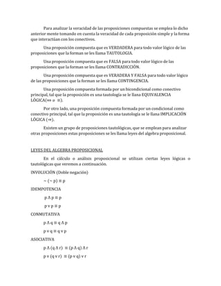El documento explica los conceptos básicos del álgebra proposicional, incluyendo: 1) Las proposiciones son enunciados verdaderos o falsos que se simbolizan con letras; 2) Los conectivos lógicos como la negación, conjunción, disyunción, etc. que combinan proposiciones; 3) Las proposiciones compuestas o moleculares formadas con conectivos; 4) Conceptos como tautología, contradicción y contingencia; 5) Las leyes del álgebra proposicional como la doble neg