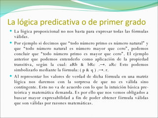 El documento describe los conceptos básicos de la lógica de predicados o de primer orden, incluyendo las proposiciones categóricas, los cuantificadores, la cantidad y cualidad de las proposiciones, y la clasificación de las proposiciones en cuatro tipos (A, E, I, O). También cubre conceptos como clases universales, determinadas, vacías y no vacías, complementos de clases, y casos no típicos en proposiciones categóricas.