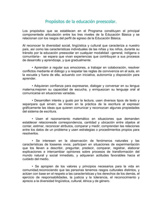 Este documento describe los propósitos de la educación preescolar en México. 1) Reconoce la diversidad cultural del país y busca que los niños desarrollen habilidades sociales, de comunicación y aprendizaje. 2) Explica las bases para el trabajo en preescolar, incluyendo características del desarrollo infantil y procesos de aprendizaje a través del juego y la interacción. 3) Resalta la importancia de una educación inclusiva y de equidad que valore a todos los estudiantes sin importar discap