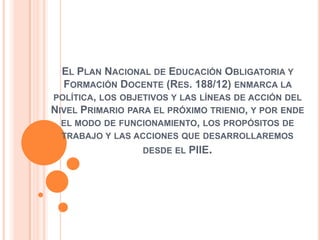 El documento presenta el Programa Integral para la Igualdad Educativa, el cual enmarca la política, los objetivos y líneas de acción del nivel primario para el próximo trienio. El programa busca ampliar el acceso y la permanencia escolar, fortalecer las trayectorias estudiantiles, y mejorar la gestión institucional. Propone objetivos como mejorar las capacidades de lectura y escritura de los estudiantes, con énfasis en tercer y sexto grado.