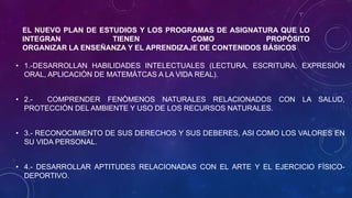 El nuevo plan de estudios tiene como propósito organizar la enseñanza y el aprendizaje de contenidos básicos para desarrollar habilidades intelectuales, comprender fenómenos naturales, reconocer derechos y deberes, y desarrollar aptitudes artísticas y deportivas. Un propósito central es estimular las habilidades necesarias para el aprendizaje permanente y generar la reflexión en los alumnos. El plan se organiza en un calendario escolar de 200 días laborales con 4 horas de clase diarias, para un total de