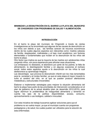 Este documento propone diseñar e implementar estrategias para minimizar la desnutrición en niños menores de 5 años en el barrio La Playa de Chigorodó a través de programas de salud y alimentación. El objetivo es identificar las causas de desnutrición e implementar visitas domiciliarias, charlas educativas, jornadas de complemento alimentario y eventos con expertos para promover una adecuada nutrición infantil. El cronograma detalla actividades entre marzo a junio sobre desnutrición, seguridad aliment