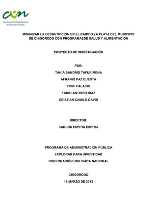 Este documento propone diseñar e implementar estrategias para minimizar la desnutrición en niños menores de 5 años en el barrio La Playa de Chigorodó a través de programas de salud y alimentación. El objetivo es identificar las causas de desnutrición e implementar visitas domiciliarias, charlas educativas, jornadas de complemento alimentario y eventos con expertos para promover una adecuada nutrición infantil. El cronograma detalla actividades entre marzo y junio sobre desnutrición, seguridad aliment