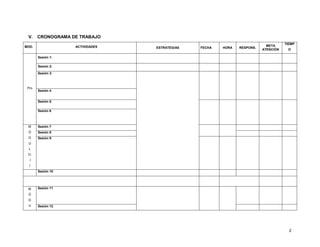 Este documento presenta una propuesta de programa que incluye cinco secciones principales: datos generales, fundamentación, objetivos, cronograma de trabajo y estructura del programa. El programa consiste en varios módulos, unidades educativas y sesiones de aprendizaje, con objetivos generales y específicos. Se propone evaluar el programa antes, durante y después de su aplicación utilizando diferentes técnicas e instrumentos.