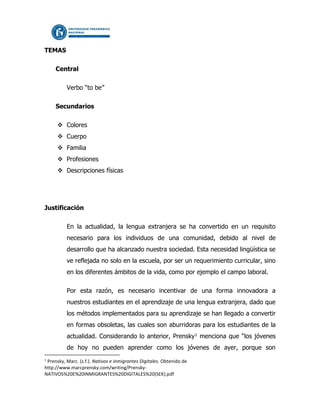 Este documento presenta una propuesta didáctica para mejorar el vocabulario en inglés de adolescentes entre 12-15 años a través de actividades multimedia. La propuesta incluye diseñar una página web con temas de inglés como colores, cuerpo y familia, y crear actividades educativas usando la plataforma Educaplay. La propuesta se implementará durante 3 semanas con estudiantes de dos colegios e incluye dos actividades por tema y una prueba final para evaluar el aprendizaje.