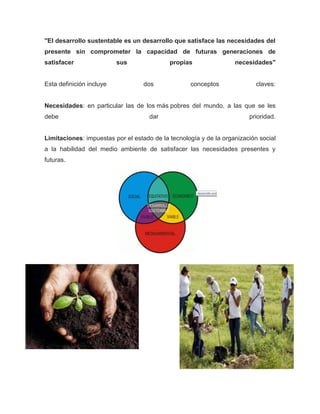 El documento propone varias acciones para lograr el desarrollo sustentable en México, incluyendo: 1) Implementar políticas públicas que compatibilicen el desarrollo económico y social con la sustentabilidad ambiental; 2) Reducir el impacto ambiental a través de mejoras en la gestión de residuos, uso de energías renovables, y transporte público; 3) Proteger los ecosistemas y la biodiversidad mediante el fortalecimiento de las leyes ambientales y áreas naturales protegidas.