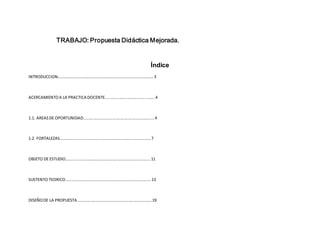 Este documento describe una propuesta didáctica mejorada para la enseñanza de problemas de sustracción en segundo grado. Incluye un análisis de las áreas de oportunidad y fortalezas de la autora, el objeto de estudio, un sustento teórico, el diseño de la propuesta, e implementación, seguimiento y evaluación. La autora propone utilizar juegos didácticos, tecnología, y actividades de colaboración y retroalimentación para mejorar la enseñanza de la sustracción.