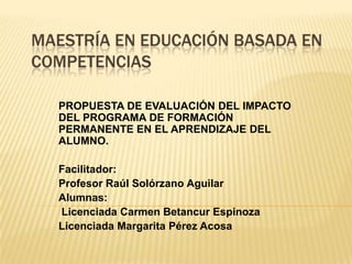 Este documento propone evaluar el impacto de un programa de formación permanente para docentes en el aprendizaje de los estudiantes. Describe los objetivos de la Reforma Integral de la Educación Básica en México y las competencias que deben desarrollar los maestros. También presenta una propuesta para evaluar las competencias docentes y su efecto en Español, siendo evaluado el programa por el Instituto Nacional para la Evaluación de la Educación.