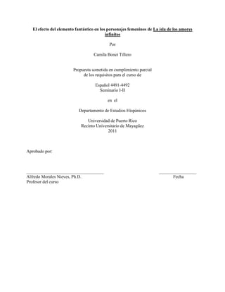 Este documento analiza la novela La isla de los amores infinitos de la escritora cubana Daína Chaviano desde una perspectiva feminista, enfocándose en cómo los elementos fantásticos afectan las vidas de los personajes femeninos. El autor justifica este enfoque al no encontrar otros trabajos que combinen estas dos perspectivas. Los objetivos son identificar los elementos fantásticos, explicar su efecto en las mujeres y demostrar cómo la fantasía y el feminismo se entrelazan en la novela. El método incluye teoría feminista y aná