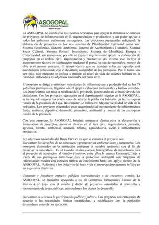 Este documento describe un proyecto para fortalecer a los gobiernos parroquiales rurales de Loja mediante la formulación de proyectos. La Asociación de Gobiernos Parroquiales Rurales de Loja (ASOGOPAL) contratará a un equipo de técnicos para elaborar proyectos de infraestructura y productividad en las 78 parroquias rurales de Loja. El objetivo general es elaborar y asesorar proyectos para cubrir las necesidades básicas de la población rural. El Gobierno Provincial de Lo
