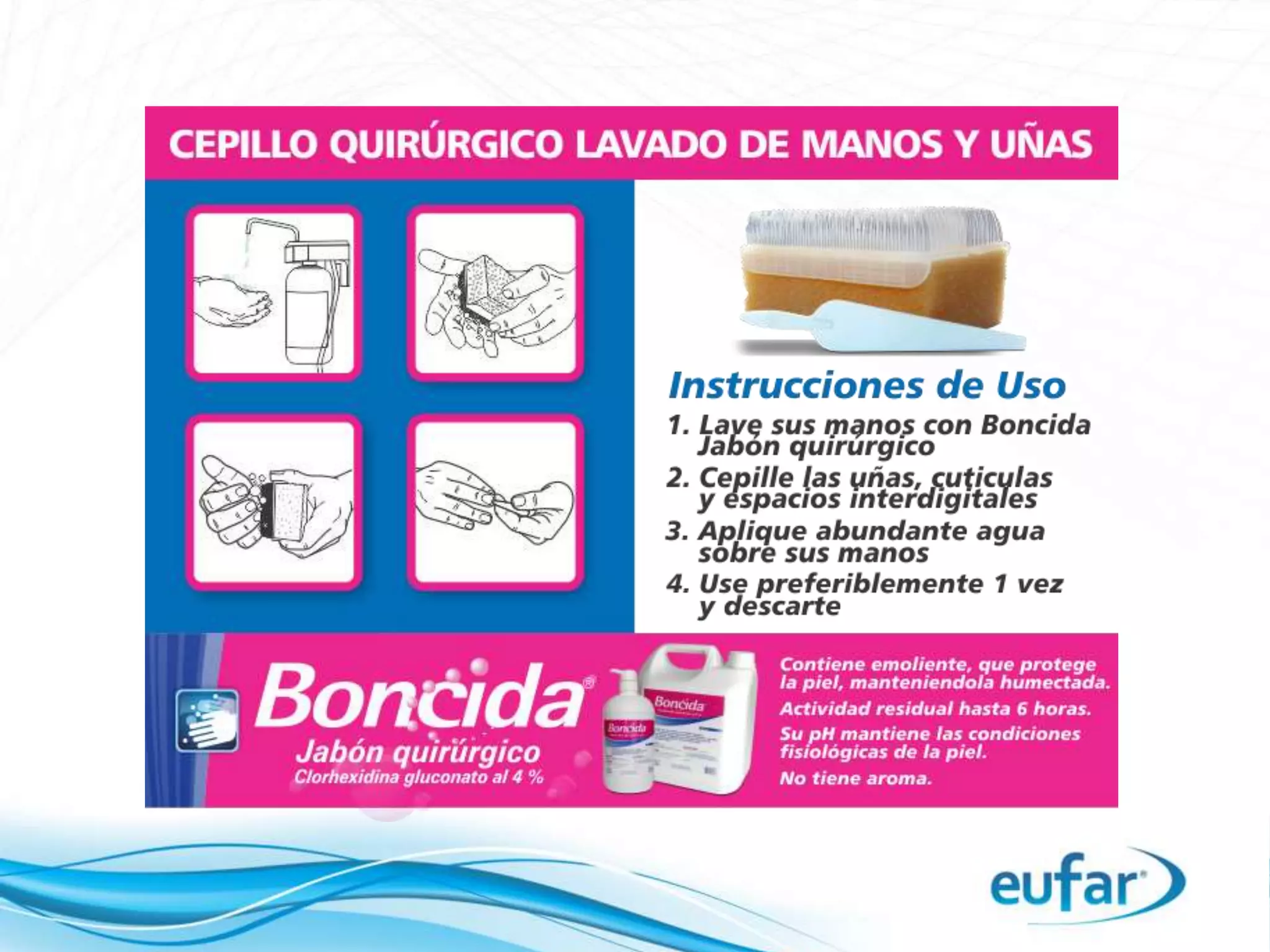 El documento describe las áreas y requerimientos de productos Eufar en clínicas, enfatizando la importancia de la desinfección, limpieza y bioseguridad en diferentes secciones como recepción, consulta externa y servicios quirúrgicos. Se mencionan productos específicos para el lavado antiseptico de manos, desinfección de superficies y manejo de instrumentos contaminados. Además, se destaca que todos los productos están bajo un sistema de calidad certificado y son biodegradables.