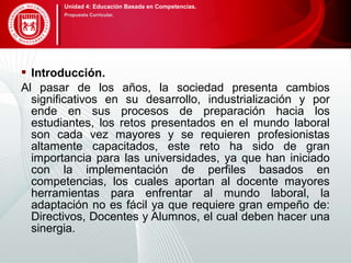 Este documento presenta una propuesta curricular basada en competencias para una licenciatura. Propone desarrollar competencias en estudiantes como aplicar pruebas psicológicas, seleccionar las adecuadas y elaborar informes. También describe estrategias de aprendizaje como ensayo, elaboración y comprensión. Finalmente, identifica competencias docentes como integrar tecnología, comunicación y adaptarse al cambio.