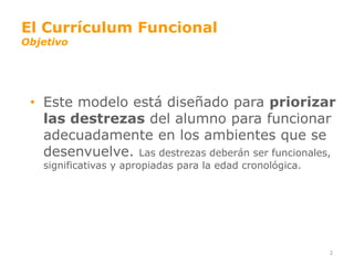 El documento describe el currículum funcional, el cual se enfoca en desarrollar habilidades que sean significativas y transferibles para que los estudiantes puedan funcionar de manera autónoma. Se define como funcional y ecológico, enseñando en ambientes adecuados. El objetivo es priorizar las habilidades de los estudiantes para funcionar bien en los ambientes donde se desenvuelven. El proceso implica analizar las preferencias, necesidades y desafíos del estudiante, familia y escuela para definir y priorizar áreas como casa,